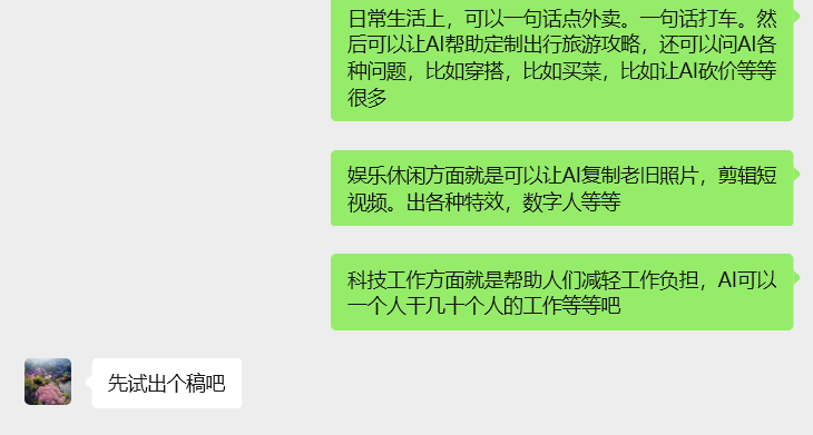 今年4月初她联系我,说要写一个关于AI搞点晒的搞笑节目,我给她写了一个详细大纲,因为网上沟通不到位,她又提了很多建议,我又重新写了第二个大纲,她看后发来抖音里的一些AI的相关视频。我告诉她她发来的这些我都了解(写大纲之前我花了很多时间查资料、理思路),她说“那就先试出个稿吧”。