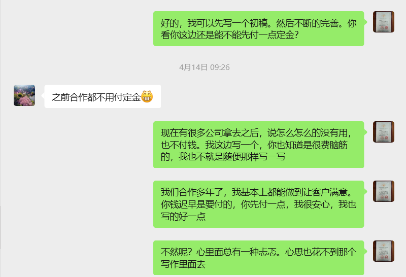 这句话让我有点不舒服了,我觉得“试出个稿”说明她对我写东西有疑虑,我的水平她应该是知道的,之所以这么说,是因为一是我们沟通还没有完全到位,我的想法她并不完全认可,但是该怎么写她也没有明确思路,我现在是像“猜盲盒”一样来写作,哪怕写得再好,她不认可就有白写的风险;二是她这个项目不稳定,存在很大的不确定性,所以我提议能不能先付部分定金,哪怕几百块钱,她回复说:“之前合作都不用付定金”