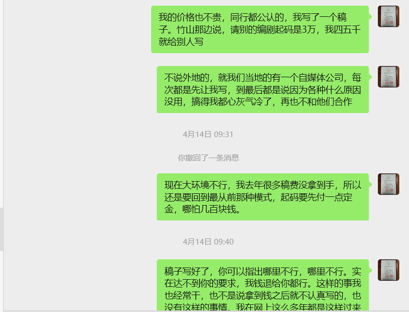 我解释了一番,她也不回话,这个3000的剧本就这么黄了。其实我如果写了,然后按照她的要求修改,大概率她会满意(我自信有这个水平)是会给钱的,这个我相信。不过我觉得她没有给我应该的尊重,哪怕后来解释一下或者说几句让我放心之类的话,我可能会写,毕竟现在大环境不好,约稿的客户越来越少了,这个3000的稿子其前期写大纲已经投入了,现在一天就可以写出来(我们当地一个工人一个月的工资),但是我感觉她没有给我应有的尊重,黄了就黄了,饿死也不写。何况我也饿不死,AI让大量的活流失了,但是我手里还有多年积累的老客户,这不马上有个导演让我去仙桃采风,定金已经打过来了。